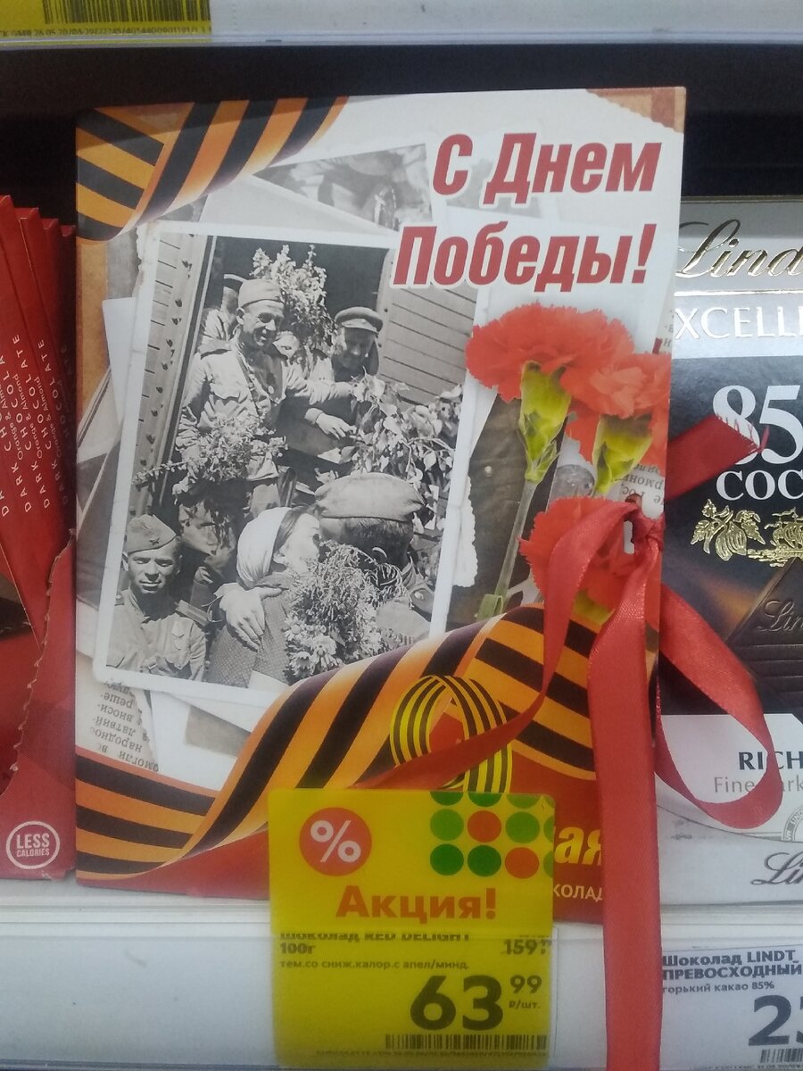 Нам тут голосовать придется за поправки к Конституции, среди которых есть про защиту исторической правды. Согласно ей умаление значения подвига народа при защите Отечества не допускается. И это правильно, поддерживаю обеими руками. Есть только вопросик один: где можно будет, а где нельзя применять символику Победы. Нам бы какой-нибудь закон с разъяснениями под эту поправку. Вот захожу я вчера в магазин и вижу такой вот шоколад. Запрещать - не запрещать? А ещё с георгиевской лентой есть водка, печенье, консервы... список продуктов, куда ушлые маркетологи прилепили символ победы, бесконечен. В СССР на георгиевской ленте на грудь героям вешали Орден Славы, а мы ее на обёртку вешаем. Разве не умаляет значимость Победы? Шоколад съедят, а обёртку в мусорку кинут. Не со зла, по привычке. Но ведь в мусорку. Нехорошо как-то, не по Конституции. Как определять будем умаление значения подвига при защите Отечества? Неплохо было бы объяснить: брать шоколад или не брать, враги или не враг