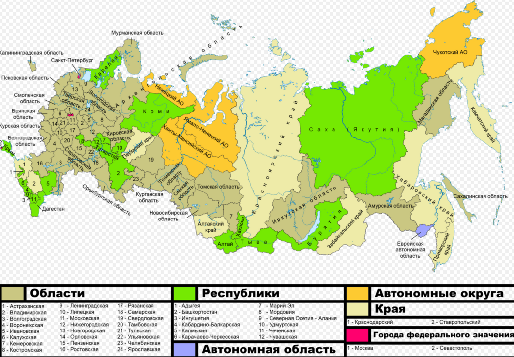 Давайте проверим на сколько хорошо вы знаете субъекты РФ. Для начала немного конкретики. В общем Россия состоит из 85 субъектов – краев, республик, городов федерального значения, автономных областей, автономных округов и областей. Каждый субъект федерации, помимо федеральных органов, имеет свою исполнительную (как правило, губернатора или главу), законодательную и судебную ветви власти. Субъекты имеют свою собственную конституцию либо устав, а также собственное законодательство, принимаемое региональными парламентами. Субъекты федерации имеют по два представителя в верхней палате российского парламента — Совете Федерации. Во взаимоотношениях с федеральными органами государственной власти все субъекты федерации между собой равноправны. Субъекты имеют полномочия решать вопросы, отнесённые Конституцией к ведению субъектов. Субъекты Российской Федерации не имеют права выхода из её состава. На данный момент у нас 46 областей, 22 республики, 9 краев, 4 автономных округа, 3 города федер