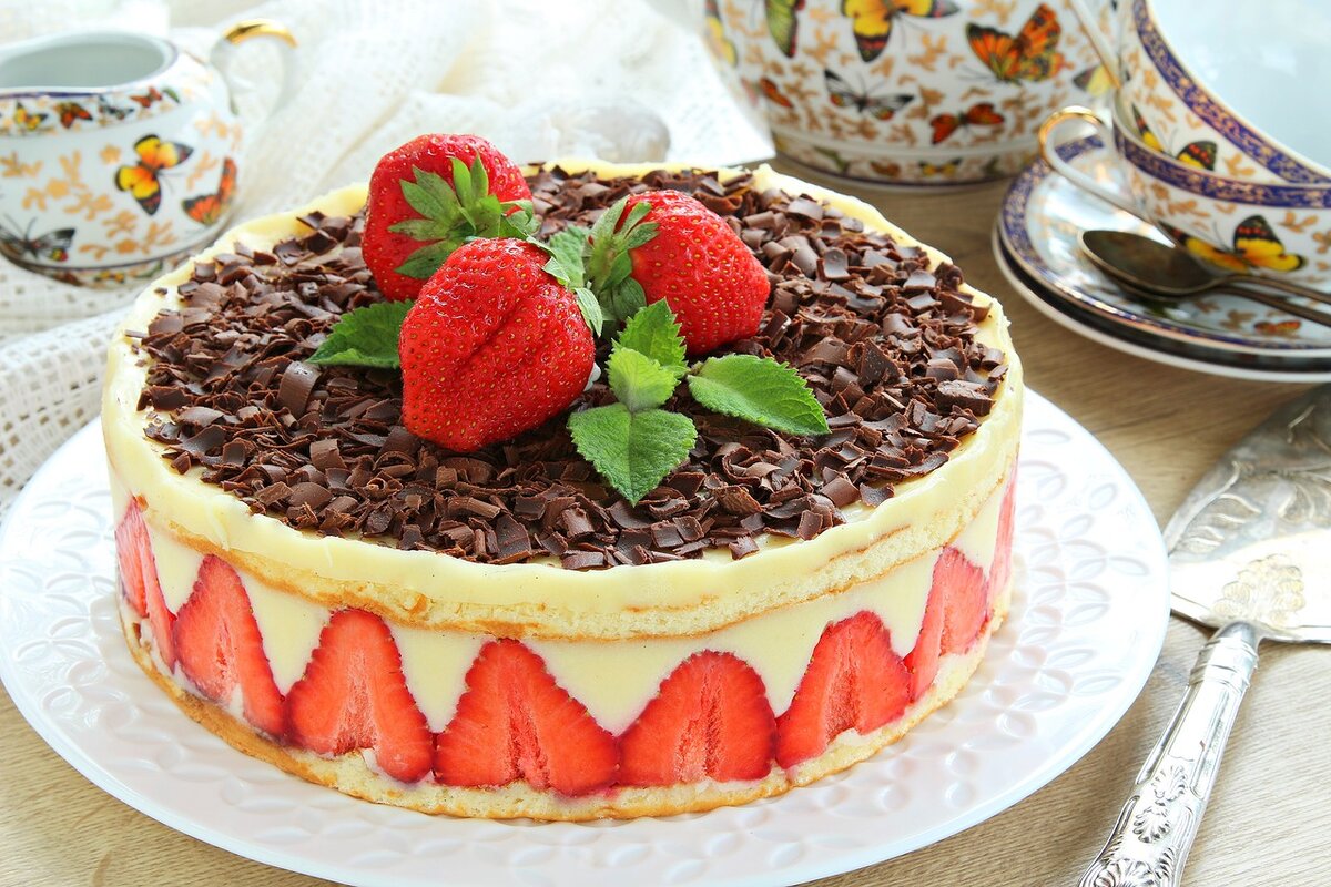 Ингредиенты Способ приготовления В кипяченной теплой воде растворить желатин, оставить на 30 минут набухать. После чего подогреть на слабом огне, но НЕ КИПЯТИТЬ! Яичные желтки растереть с сахаром, поставить на водяную баню и подогреть, постоянно взбивая венчиком или миксером. Снять яичную массу с огня. В желтковую сладкую смесь добавить маскарпоне, растопленный желатин, ванилин. Всё перемешать. Охлажденные сливки взбить миксером в пышную пену и добавить в основную массу. Перемешать крем снизу вверх лопаткой до однородности. Ягоды помыть, порезать произвольно. Бисквитный корж смазать небольшим количеством приготовленного крема. Выложить порезанную клубнику ровным слоем. В центр выложить большое количество крема. Добавить остальные ягоды, накрыть вторым коржом. Сверху и по бокам торт обмазать остатками крема. Украсить растопленным шоколадом и ягодами. Убрать муссовый десерт на 5 часов в холодильник для застывания. ПРИЯТНОГО АППЕТИТА! Если Вам понравилась статья, ставьте лайк и