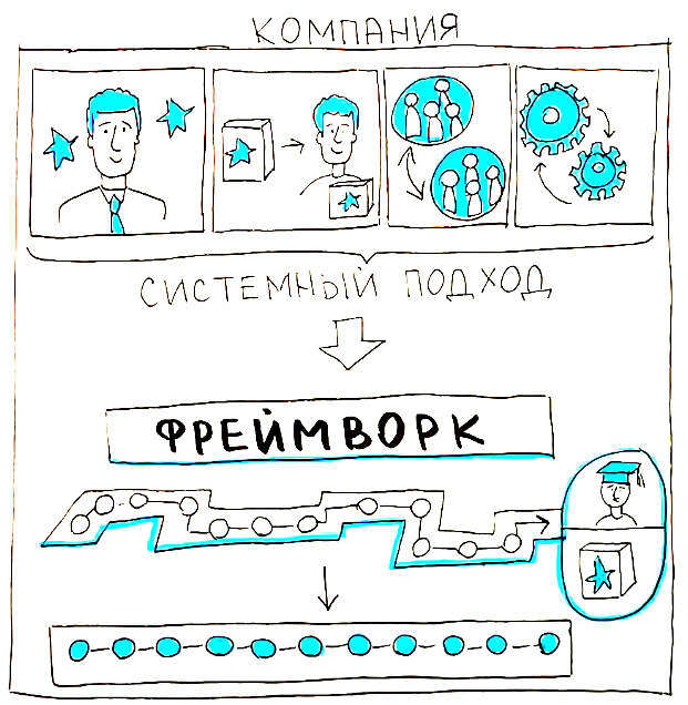 Для того, чтобы бизнес – организация получала то, что она хочет - высококвалифицированных сотрудников, быстрое производство нужных клиентам продуктов, эффективное взаимодействие подразделений – и работала как слаженный механизм, необходим системный подход. Его реализация – это фреймворк. Это подробное, пошаговое описание того, что надо делать для получения результатов в процессе решения определенной задачи. Например, задачи обучения или создания инновационного цифрового продукта. Фреймворк – это целая система различных составляющих. Каких? 1. Это методологии и методики, включающие шаблоны и алгоритмы для создания необходимых артефактов; 2. Знания, накопленные экспертами в направлении, с которым связан фреймворк, лучшие практические кейсы по процессам – то, как надо делать; 3. Навыки и компетенции, необходимые для решения задачи. На базе фрейморков рождаются уникальные , успешные культуры, известные на весь рынок. Фрейморки могут быть более жесткими, как проектная модель и гибкими –
