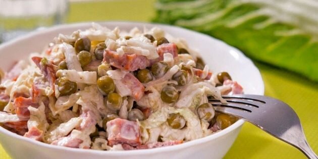 Ингредиенты: Приготовление Колбасу и помидоры нарежьте соломкой, капусту нашинкуйте, добавьте горошек и заправьте майонезом. Не забудьте поперчить, так вкуснее.