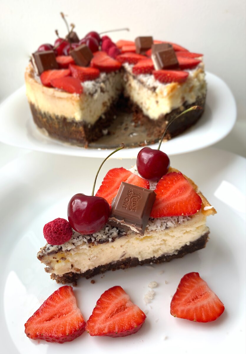 Лучший простой рецепт нежнейшего чизкейка. Ваши близкие будут в восторге! Видео по шагам здесь. Ингредиенты: Сыр маскарпоне 500 гр, творог 50 гр, 230 гр песочного печенья (у меня 1 пачка юбилейного и 1 пачка «к чаю»), 2/3 пачки слив масла, сахарная пудра 200 гр, ванилин, 3 яйца, цедра 1/2 лимона, ложка какао, 1/2 чёрного и белого шоколада, пакетик желатина, кокосовая стружка. Шаг 1. Готовим песочный слой: пробиваем печенье в блендере, растапливаем сливочное масло, смешиваем, добавляем ложку какао и утрамбовываем в форме для выпечки. Форму предварительно застелить бумагой для выпечки. Шаг 2. Выпекаем песочный слой 15 минут при 180 градусах, даём остыть. Шаг 3. Параллельно готовим сырный слой: взбиваем блендером на низкой скорости 3 яйца, цедру лимона, сахарную пудру, сыр маскарпоне, творог, ванилин до однородной консистенции. Стремимся избежать пузырьков в сырной смеси. Заливаем в форму. Выпекаем сначала 15 минут при 220 градусах и ещё 1 час 30 минут при 100-120 градусах на двусто