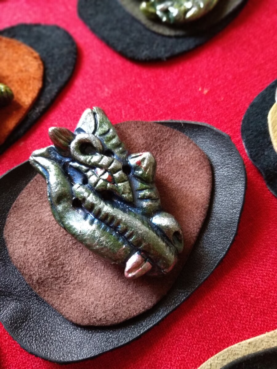 Из остатков кожи и полимерной глины решила я сделать несколько кулонов и автомобильных украшений. Нарезала остатки кожи, обработала воском бля блеска и начистила кожу мастикой. Налепила головы дракошек и раскрасила их модельными красками Тамия. Применяла мокрую кисть и присыпку сухой краской, затем натерла воском для детализации и покрыла алкидным лаком для блеску в глазках. Получились вот такие рожицы - сделаю им кожаные шнурки для таскания на шее, в автомобиле, также можно повесить на стену. Скоро придумаю что-нибудь еще. Всем пока!