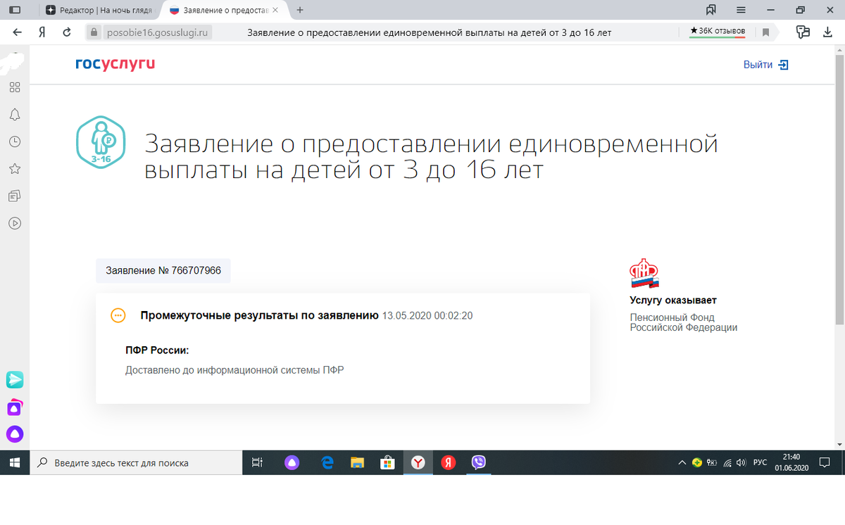НАЧАЛОСЬ, многие регионы уже получили свою выплату с пометкой "пенсия". Есть и те авторы ,которые сначала написали пост, дождались опубликования, а потом дописывали, что получили. В нашем городе, среди тех кто смог подать заявление 12 и 13 мая, тоже уже получили. Подавали так же как и Я через Госуслуги. Я сегодня, ну очень много раз, заходила на сайт ГУ, а там как была информация "Доставлено до информационной системы ПФР" , дата 13 мая! Что это значит, никто не знает. Писала на сайте ПФР вопрос, там тишина. Продолжение... Звонила 2 числа в местное отделение ПФР, там моего заявления не видят, сказали через неделю перезвонить, когда у них будет четкий алгоритм работы с пособием. На сайте ПФР, робот не отвечает на вопросы, они тоже висят "зеленые". Отправила вопрос по электронной почте на сайт Госуслуг, так как чат ГУ тоже висит, думает долго. Чего то я последнее время только и делаю что жалуюсь на работу гос.организаций, точнее на НЕ работу. Будем ждать, а то деньги ужас как нужны, пол