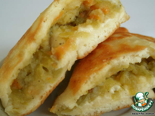 ИНГРИДИЕНТЫ ДЛЯ ТЕСТА: Мука - 550 г Сахар - 1,5 ч.л Сода - 0,5 ч.л Соль - 0,5 ч.л Кефир - 300 мл (или минеральная вода) Яйцо - 1 шт Масло растительное - 4 ст.л ДЛЯ НАЧИНКИ: Огурец соленый - 10 шт(можно меньше) Лук - 1 шт Морковь - 1 шт Картофель - 2 шт (крупный) Масло растительное - 4 ст.л Перец черный молотый - 0,5 ч.л Соль Сахар Дополнительно: Масло растительное - 6 ст.л (для жарки) ПРИГОТОВЛЕНИЕ Натрём морковь на тёрке, лук нарежем кубиками и обжарим на растительном масле до золотистого цвета. Соленые огурцы натрём на крупной тёрке и, добавив к обжаренным луку и моркови, потушим на среднем огне до испарения жидкости 10 минут. Отварим картофель и приготовим из него картофельное пюре, предварительно слив почти всю жидкость, в которой варился картофель. Смешаем картофель с обжаренным луком, морковью и солёными огурцами, посолим, поперчим по вкусу, добавим 1 ч.ложку сахара для баланса вкуса и поставим остывать.