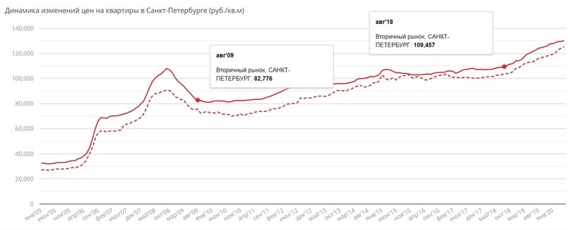 Мне кажется, что все больше и больше людей понимает, что данный кризис не пройдет бесследно для рынка недвижимости. Доходы населения в стране непрерывно падают с 2008 года, а сейчас еще наложилась ситуация с карантином, вследствие чего очень многие люди лишились доходов. И мне сейчас очень стыдно за некоторых коллег, которые до сих пор вещают в своих соц.сетях, что цены будут расти — бегите, покупайте сейчас, недвижимость все время растет в цене и никогда не падает (хотя, уже даже слепой и глухой понимает, что будет спад). Но давайте разберемся, так ли это на самом деле. Тот кризис, который мы наблюдаем сейчас, не первый и не последний в нашей стране и можно проанализировать ситуацию по предыдущим годам. И смотрите какая ситуация с ценами в Санкт-Петербурге в период с 2005 по 2020 год: На графике все красиво и вы, вполне логично, можете предположить, что цены растут. Но если взять калькулятор и посчитать, то все не так гладко: я взяла 2 контрольные точки — после кризиса 2008 года (подр
