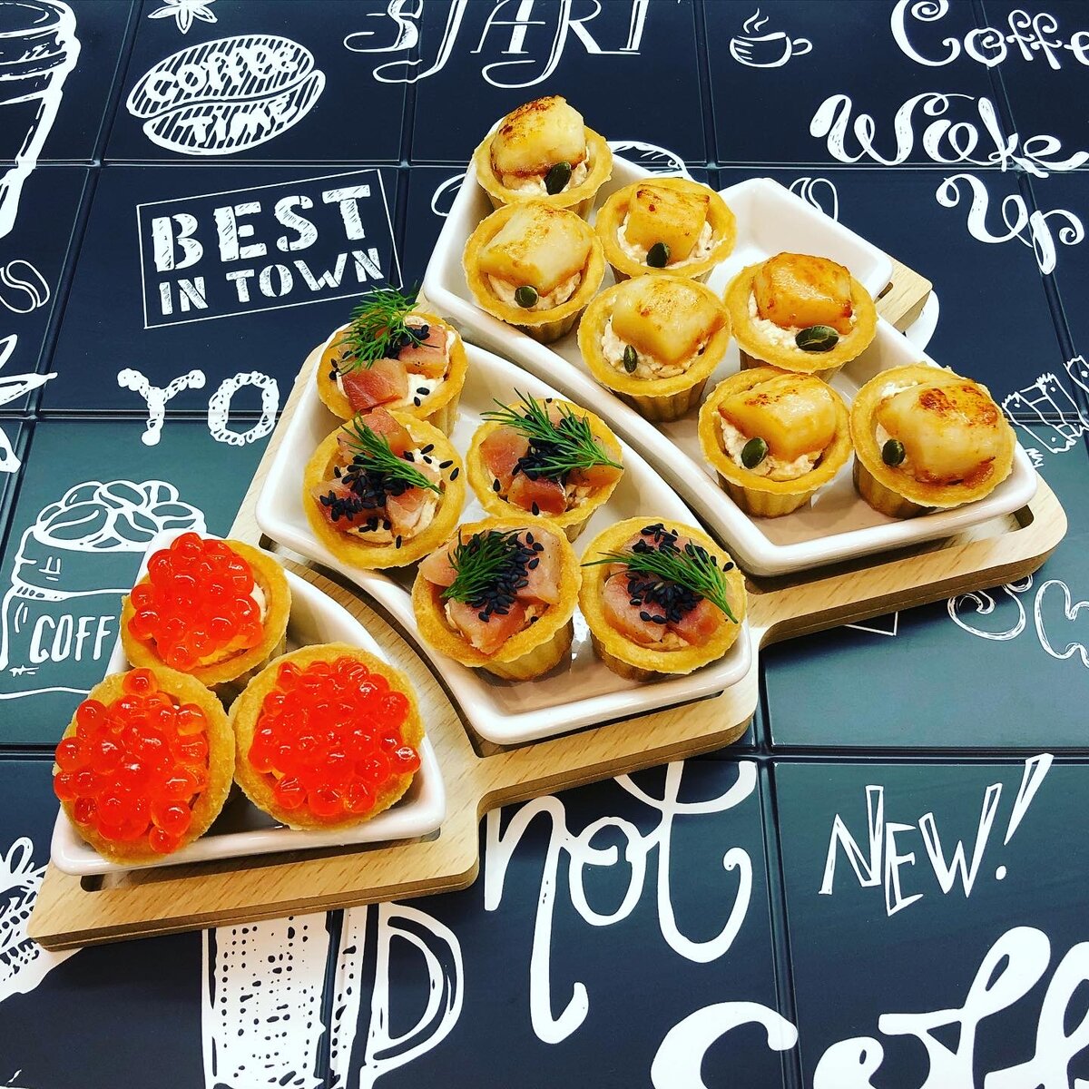 Быстро, вкусно, эффектно Тарталетки приготовить очень просто! Однозначно они станут украшением вашего праздничного стола👌 Начинка для тарталеток может быть любая, это все зависит от ваших вкусов, ну и, конечно же, фантазии! Я приготовила ассорти из 3-х видов начинки: с красной икрой, соленой рыбой и ароматным курильским гребешком. Основа во всех 3-х вариантах одинаковая - это сливочный сыр с томатами и базиликом. Можно использовать любой творожный или сливочный сыр. Для приготовления нам понадобится: ✔️готовые тарталетки - 1 упаковка ✔️сыр сливочный с томатом и базиликом - 1 упаковка 150г ✔️свежий гребешок курильский средний - 5 медальонов ✔️икра красная ✔️соленая красная Рыба ✔️чёрный кунжут ✔️тыквенные семечки ✔️укроп свежий Подготавливаем наши ингредиенты. Рыбу нарезаем на небольшие кусочки. Я использую кету (подойдёт любая соленая или копченая рыба). Медальоны гребешка разрезаем пополам и обжариваем на сливочном масле на небольшом огне до румяного цвета. Кунжут и тыквенные се