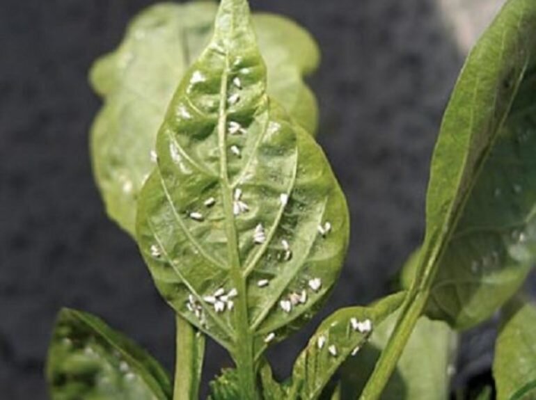 Перец атакует огромное количество вредных насекомых, многие из которых являются опасными и способны уничтожить весь урожай за считанные дни. Чтобы этого не произошло, нужно своевременно выявлять и бороться с врагами овощной культуры. Перец – очень вкусный и полезный овощ, богатый витаминами и микроэлементами. К сожалению, так считаем не только мы, но и многочисленные вредители, которые ежегодно уничтожают часть тепличного урожая перца. О самых опасных из них мы сегодня расскажем, а также научим, как бороться с мелкими пакостниками. Белокрылка Пожилым людям и огородникам со слабым зрением непросто бывает обнаружить белокрылку на участке. Несмотря на броский внешний вид взрослых особей (4 снежно-белых крыла насекомого будто обсыпаны мукой), белокрылка является скрытным и осторожным вредителем. Длина ее тела (светло-желтого окраса) всего 3-5 мм, и большую часть времени она прячется на внутренней стороне листьев. Неопытные огородники часто путают белокрылку с молью, которая почему-то оче