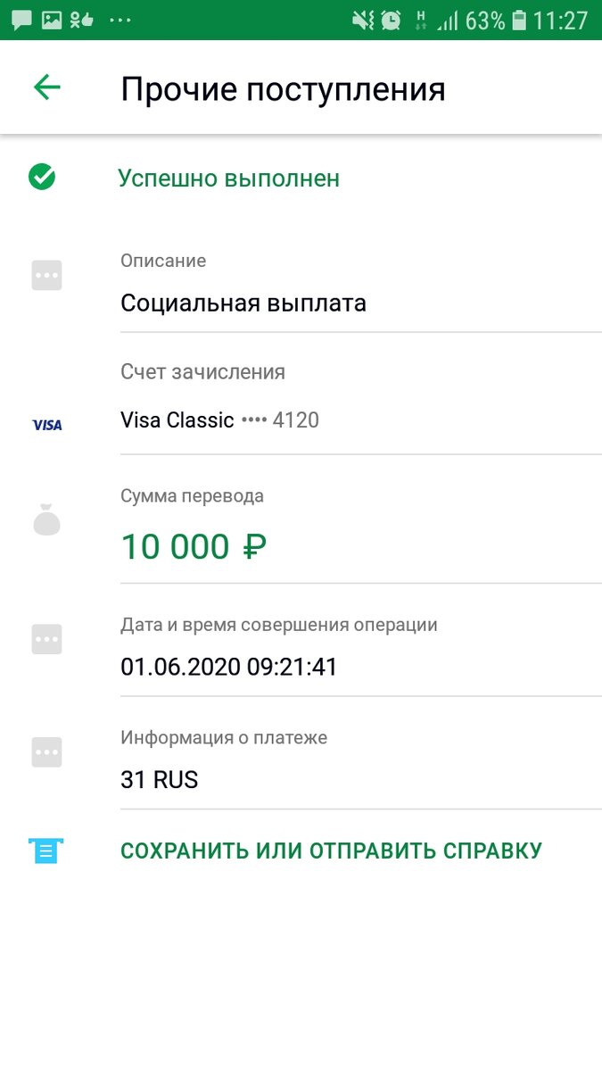 Сегодня зашла в личный кабинет сбербанка и вижу - социальная выплата, 10 000 рублей зачислено на карту!!!