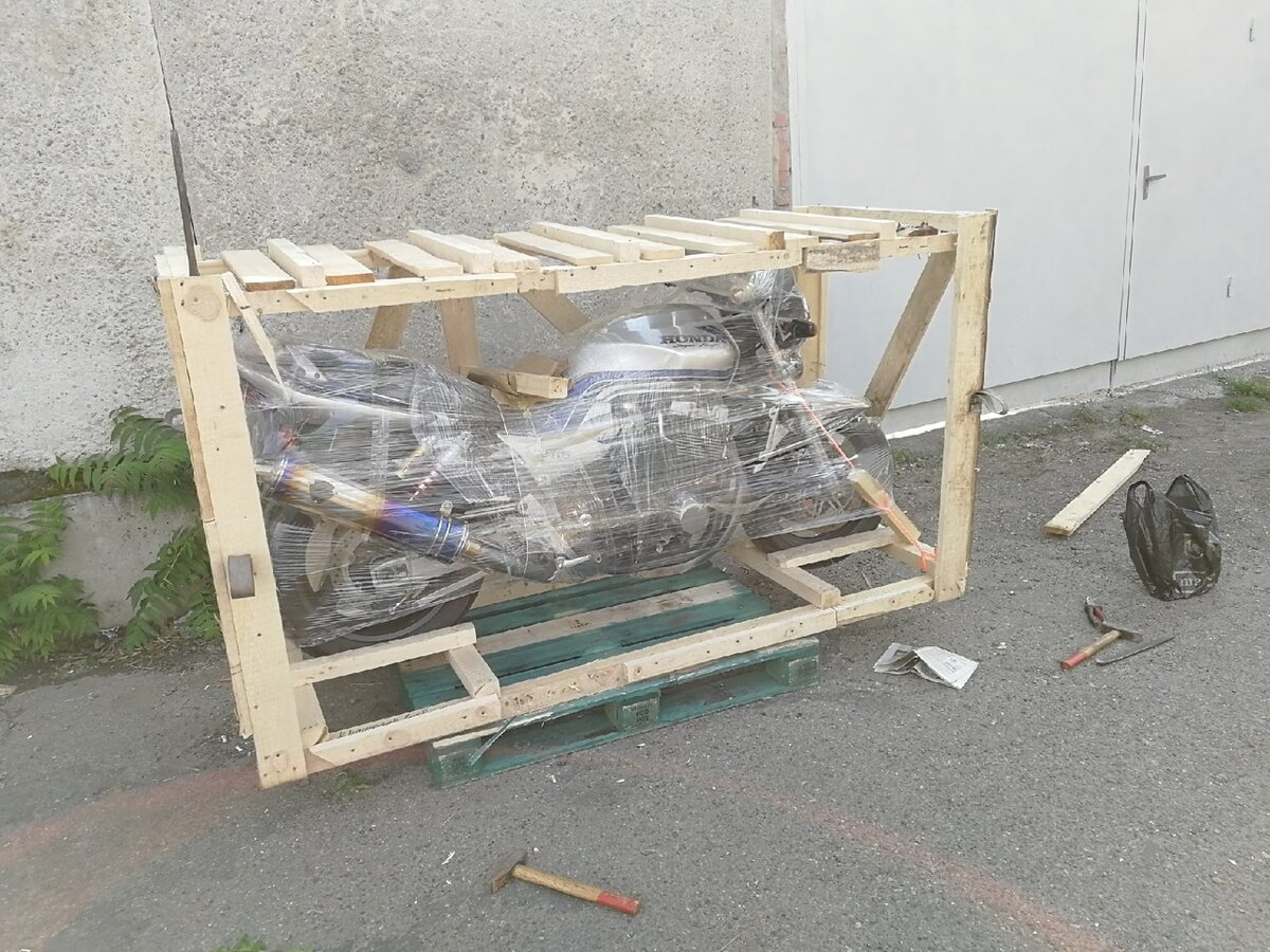 Спустя пару недель проходит аукцион и вот мой будущий двухколесный друг готовится к отправке, ещё через неделю курьером ко мне приходит папка с документами на мотоцикл и ещё через месяц пришла и сама посылка, аж в 290 кг, г. Краснодар