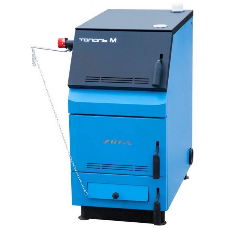 Здравствуйте! Я не сотрудничаю ни с производителями, ни с продавцами отопительного оборудования. И в своих статьях буду честно рассказывать о котлах отопления, об их достоинствах и недостатках, об отзывах владельцев. Сегодня я расскажу о котлах ZOTA Тополь М Эти котлы есть в любом магазине отопительного оборудования. Выпускаются котлы мощностью 14, 20, 30, 42,60 и 80 кВт. Внешний вид котла эстетичный, декоративный корпус очень хорошо сохраняет температуру теплоносителя в котле. Котлы сварены из стали 3 мм, поэтому довольно лёгкие. Необходимо приобрести за 1,5 -2 т. рублей ёрш для регулярного шомполения газоходов. Нагар в 1 мм снижает теплопередачу на 10 градусов. В комплекте с котлом идёт выход на дымоход с шибером Котёл ZOTA Тополь М несложно сделать полуавтоматическим, смонтировав в поддувало вентилятор, управляемый автоматикой. Комплект автоматики за 16 290 руб. - 20 590 руб. предлагается производителем как опция, можно приобрести аналог, также изготовленный в Пол