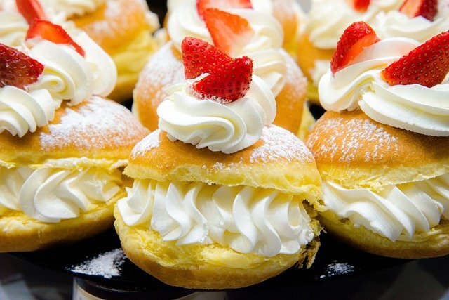 Иногда так хочется побаловать себя и своих близких чем-нибудь вкусным. Заварные булочки с вкуснейшим и ароматным творожным кремом или, по-другому, домашние эклеры - как-раз то, что надо. Ингредиенты самые обычные: Для теста: -Маргарин – 100 грамм; -Мука – 250 грамм; -Яйца – 4-5 штук; -Соль - 0,5 чайной ложки Для крема: -Творога – 300 грамм; -Сливки - 100 мл; -Сахарная пудра -100 грамм; -Коньяк - 1 столовая ложка; -Ванильный сахар - 0,5 пакетика Для украшения: -Молочный шоколад - 100 грамм Смешать в кастрюле 350 мл воды, соль, маргарин. Довести полученный состав до кипения. Добавить муку, не переставая мешать, пока тесто не будет отставать от стенок кастрюли. Дать тесту немного остыть. В тесто по одному ввести яйца. Готовое тесто должно быть мягким и однородным. Нагреть духовку до 220 С. Противень застелить бумагой для выпекания. Переложить тесто в кондитерский мешок и выдавить на противень в виде небольших шариков. Поставить в духовку, а через 15 минут температуру в духовке снизить д