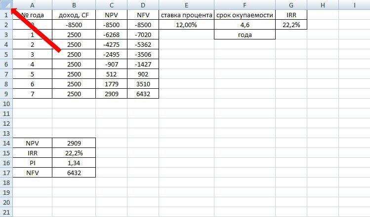 Сразу все ячейки можно выделить комбинацией клавиш Ctrl + A, которая, кстати, работает и во всех других программах.