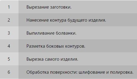 Для изготовления по самым разным технологиям используют в качестве материала из дерева кап, ствола нижнюю часть, корневище.