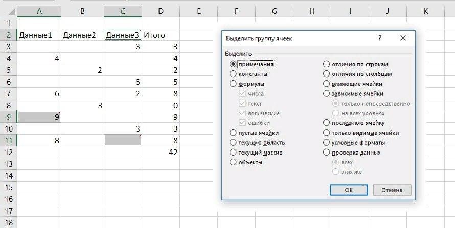 Выделяются только те ячейки, которые содержат примечания.