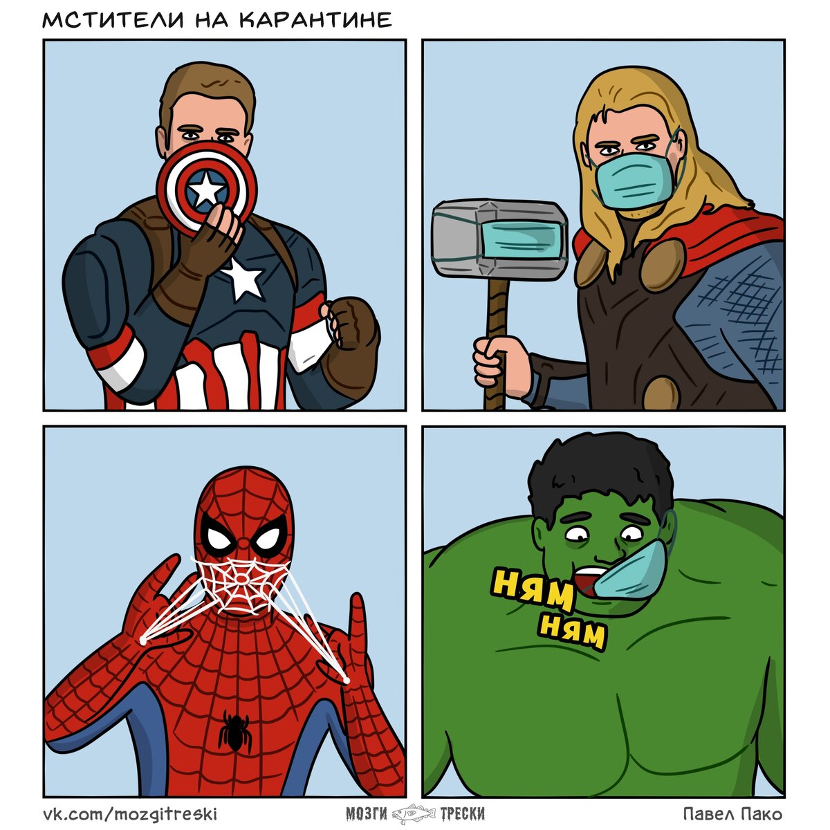 Чтобы новая аудитория увидела ваши работы - эти работы нужно активно выкладывать. В этот раз я не стал идти по проторенной дорожке с ретроспективой лучших комиксов, а решил бросить все силы на создание нового контента - к счастью, немного свободного времени у меня на это как раз нашлось. Накидывая идеи для новых комиксов, я почему-то вспомнил про супергероев. Как известно, многие супергерои носят маски, но в наше время маской на лице уже никого не удивишь - все вокруг заботятся о безопасности. И тут я подумал, а какие нюансы в ношении медицинских масок могли бы возникнуть в жизни известных героев Marvel? К примеру, у тех же Мстителей.