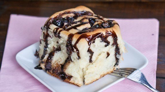 Ингредиенты: Тесто: Дрожжи - 2,25 чайной ложки Теплое молоко - 3/4 стакана 3 яйца Ванилин - 1 чайная ложка Мука - 4,25 стакана Крахмал - 1/4 стакана Сахар - 1/2 стакана Сливочное масло - 165 г Соль - 1 чайная ложка Начинка: Сахар - 1/4 стакана Сливочное масло - 3 столовых ложки Кусочки шоколада - 200 г Черника - 200 г Топпинг: Шоколадный сироп (опционально) Приготовление: 1. Разведите в теплом молоке дрожжи и сахар. Оставьте активироваться на 10-15 минут. 2. В чаше для миксера смешайте муку, крахмал и соль. 3. В миску с активировавшимися дрожжами вбейте яйца и добавьте ванилин. Взбейте венчиком. 4. Смешайте обе смеси и начните взбивать тесто на низкой скорости. Добавьте кусками сливочное масло. Продолжайте взбивать до однородной массы. При необходимости добавьте дополнительно муки. 5. Переложите тесто в миску, смазанную подсолнечным или оливковым маслом, накройте кухонным чистым сухим полотенцем и оставьте на 1-2 часа пока оно не увеличится вдвое. 6. В это время смажьте форму д