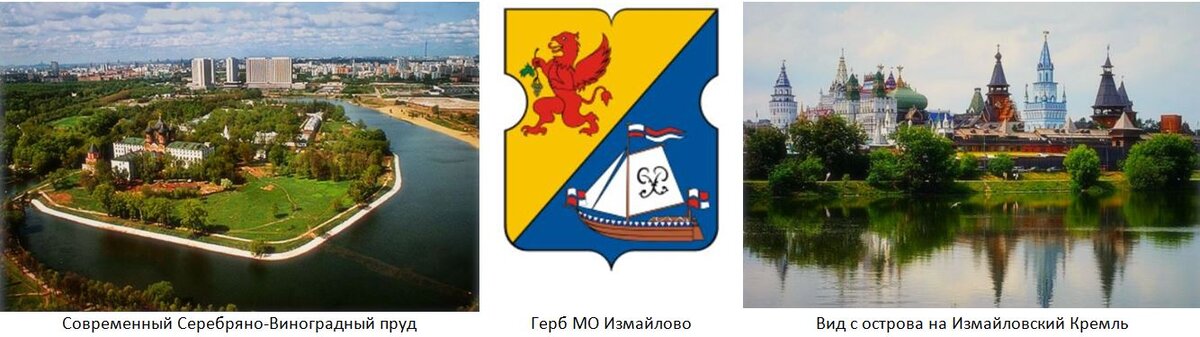 Символичен герб современного Измайлово: грифон (род Романовых) держит гроздь винограда (виноградники здесь плодоносили!), а в голубизне воды плывет к морским победам ботик Петра.