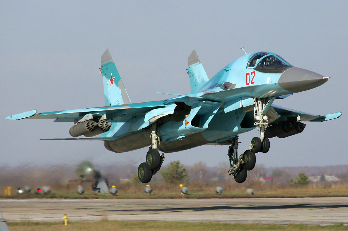 Су-34 (изделие «Т-10В», по колификации НяАТО: Fullback — «Защитник») - советский/российский многофункциональный саерхзвуковой истребитель-боибардировщик, предназначенный для нанесения ударов авиационными средствами поражения по наземным целям противника в оперативной и тактической глубине в условиях сильного противодействия средствами противовоздушной обороны противника и применения современных средств радиоэлектронной борьбы, поражения воздушных целей противника днём и ночью в простых и сложных метеорологических условиях. Создавался в качестве замены фронтовому бомбардировщику СУ-24. Данная машина спроектирована как продольный триплан, который имеет интегральную компоновку. Крылья аппарата сопряжены с корпусом машины по интегральной схеме. Они имеют трапециевидную форму, а передняя их кромка стреловидной формы. Хвостовая часть самолета практически такая же, как и в предыдущей версии. Кабина имеет места для пилота и штурмана, она полностью герметичная и бронированная. Кабина отапливае