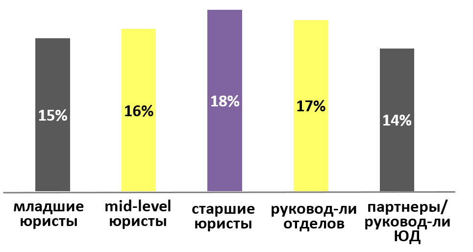В исследовании участвовали юристы в возрасте от 18 до 50 лет, в позиции от младших юристов до партнеров и руководителей юридических департаментов.
