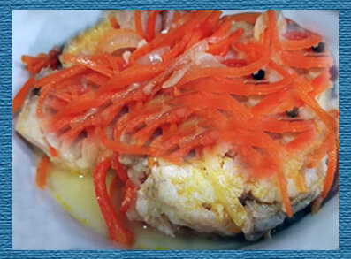 Сначала обжариваем мелкопорезанный лук в небольшом количестве жира, выкладываем на тарелку, потом также поступаем с морковью, которую натираем на тёрке. Рыбу, порезанную на кусочки, обваливаем в муке с солью и тоже обжариваем со всех сторон. Укладываем в сотейник рыбу, на неё лук и морковь. В стакане воды размешиваем соль, сахар, уксус, перец по вкусу и выливаем поверх рыбы. Томим на медленном огне под закрытой крышкой 8–10 минут.