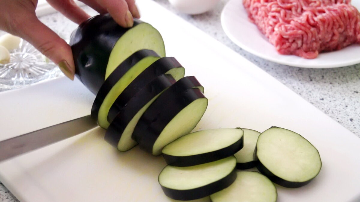 1. Баклажаны нарезать кружочками толщиной 0,5 см, посолить и оставить на 5 минут.