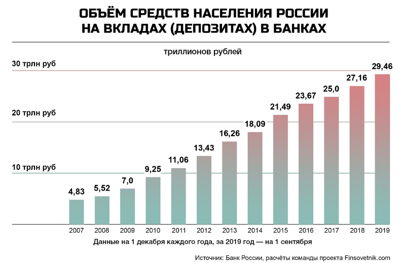 Бедность населения в нашей стране колоссальна. Многие области имеют более 20% бедного населения (тех, чьи доходы подходят под это определение). Получается, вся проблема в низких доходах? Вовсе нет, по разным оценкам, на вкладах в банках население РФ держит около 25-30 триллионов рублей! На такие деньги можно приобрести несколько нефтегазовых компаний! Казалось бы, сними деньги с вклада и вложи в Газпром или Роснефть и получай % от доходов этой компании пассивно, больше чем на вкладах! Вот он, пресловутый процент от эксплуатации природных ресурсов России! Но нет, наши люди несут деньги ростовщикам, которые кредитуют население. И не хотят понимать, что вклады — это банковский продукт, с которого зарабатывают банки, а не они. Государство видит такое положение вещей и начинает по-потихоньку стимулировать людей на более активное инвестирование средств. Например, с 2021 года будет изыматься налог 13% на доход, полученный от вкладов свыше 1 млн.руб! Статистика. Большинство людей хотят достичь