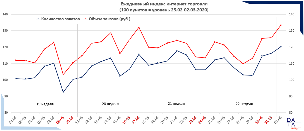 Мы ежедневно собираем данные с крупнейших интернет-магазинов (более 60% всех заказов в Рунете) и высчитываем индекс, как динамику заказов интернет-магазинов от "нулевой" недели (7 дней от 25 февраля).