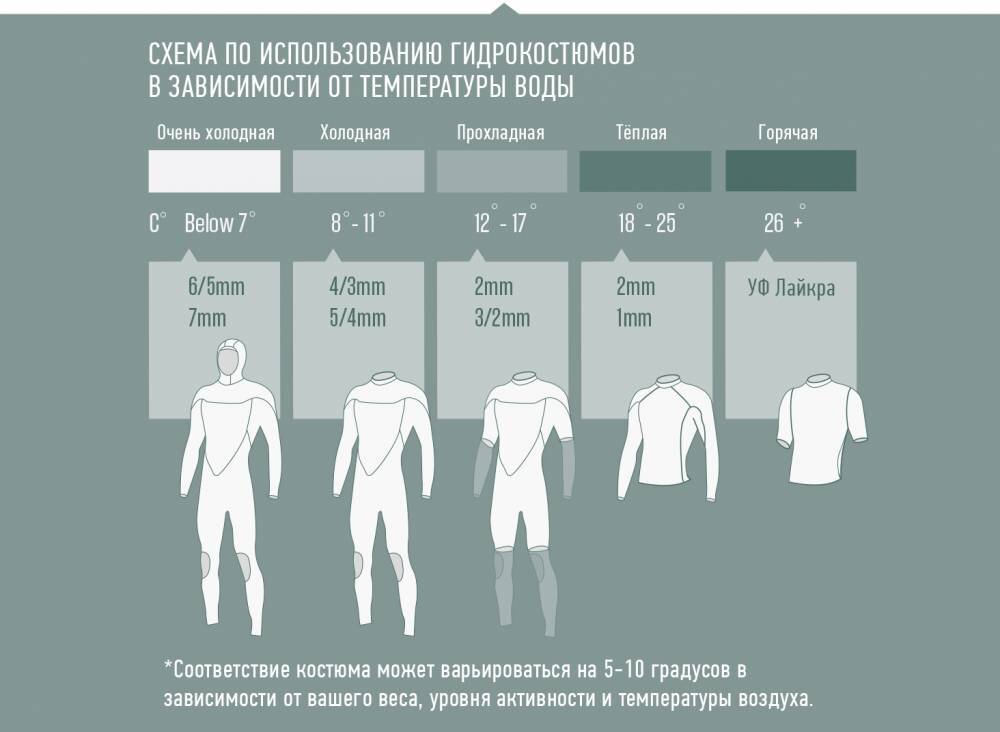 Толщина может также существенно различаться — от 2 до 6 мм. Чем толще – тем теплее. Любители поплавать в холодной воде выбирают полусухой (semi-dry), который делают не из неопрена. Сегодня существуют даже гидрокостюмыс по