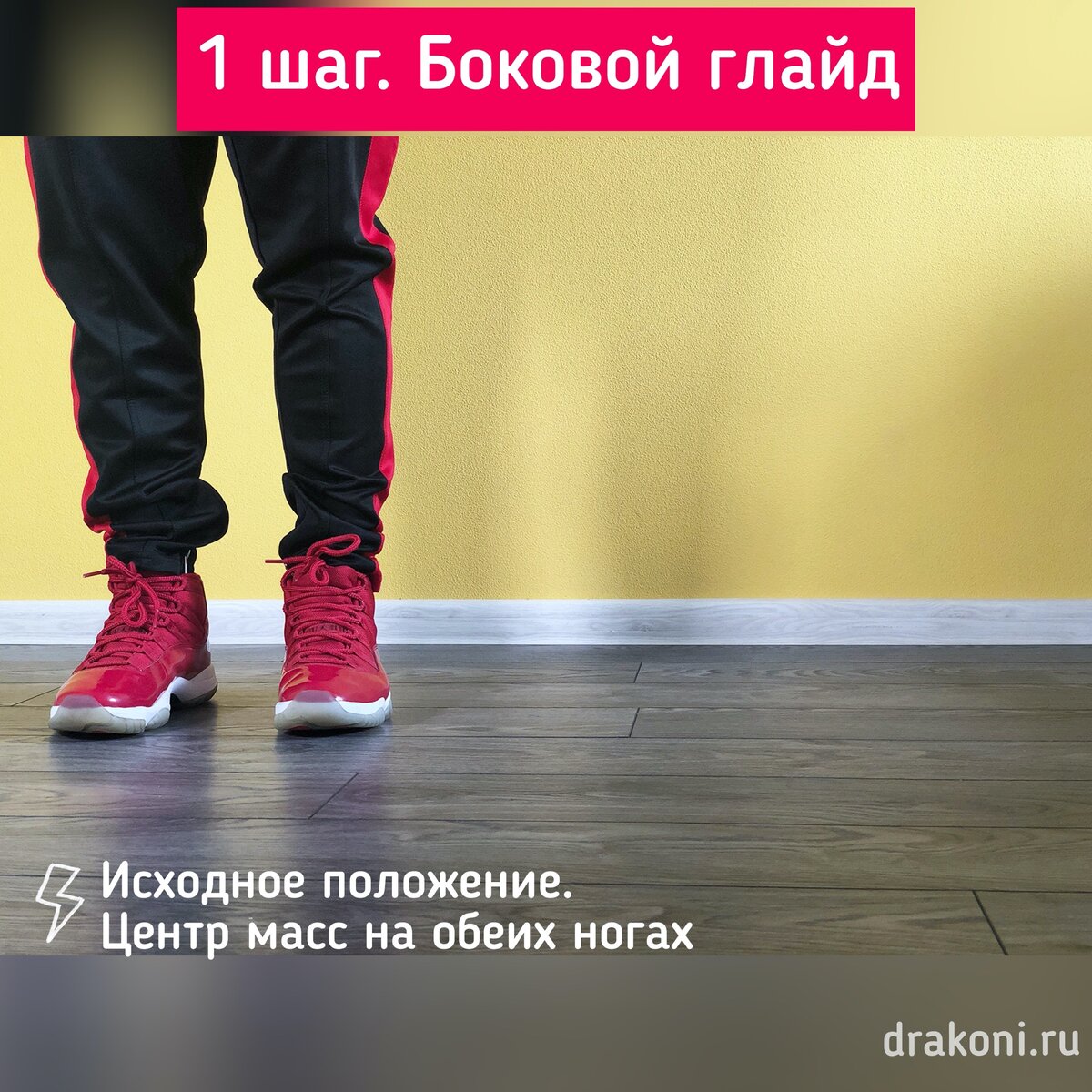 1. Исходное положение. Ноги стоят рядом друг с другом. Носки смотрят строго вперед.