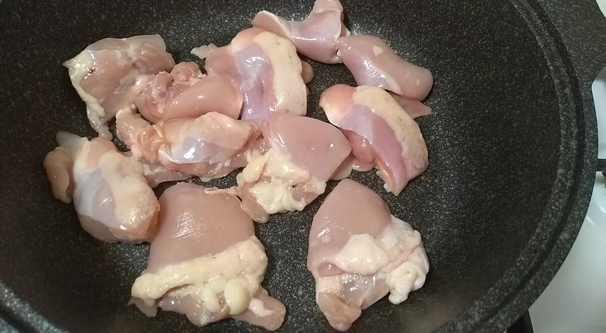Для приготовления нам понадобится мясо с прослойками жира. Крупными кусками нарезаем мясо и обжариваем.