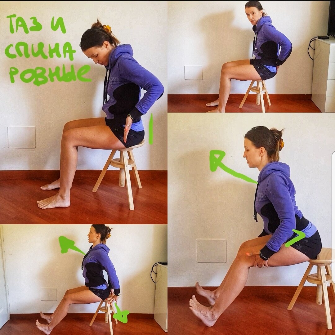 Итак, если Вы долго сидели, то начните просто с того, что, оттолкнувшись от сиденья стула, вытянитесь и расположите таз так, чтобы он отклонялся немного вперёд, а не назад, как часто бывает в положении сидя.