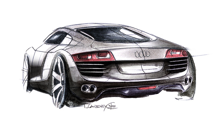 Первый в новейшей истории марки среднемоторный спорткар Audi R8 своим названием напоминал об успехах легендарного прототипа R8, многократно побеждавшего в начале двухтысячных в гонках на выносливость WEC. Необычность форм подчеркивалась использованием в экстерьере и в салоне элементов из карбона и алюминия, эксклюзивными цветами кузова и особыми колесными дисками. Современная модель Audi R8 V10 quattro по сей день является флагманом линейки спорткаров марки. Авторство дизайна модели Audi A5 Co