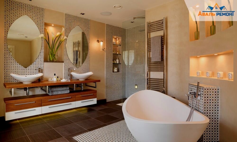 1.Ванна в стиле кантри Ванная комната в стиле кантри. Каменный пол в сочетании с черно-белой плиткой придает помещению ощущение яркости и открытости. Ванна в форме яичной скорлупы имеет душевую насадку, а туалетный столик с двойной раковиной очень удобен для утренних процедур. Другими замечательными элементами дизайна являются использование жалюзи в качестве вешалки для полотенец и множество ниш для хранения вещей и косметики. Зеркала в форме яичной скорлупы связывают воедино дизайн всей комнаты. 2. Ванна для детей Этот веселый цветочный дизайн – идеальный выбор домашнего декора для детей. Успокаивающая пастельная синева стен в сочетании с яркими фиолетовыми цветами на занавесках и аксессуарами в полоску, помогут детям с удовольствием проводить утренние процедуры. Маленькие разноцветные стульчики и наличие ручек помогут вашим малышам легко выбираться из ванны. Дизайн с балдахином и люстрой также добавляют визуальный интерес к ванной комнате, которые имеют устаревший стиль. 3. Голли