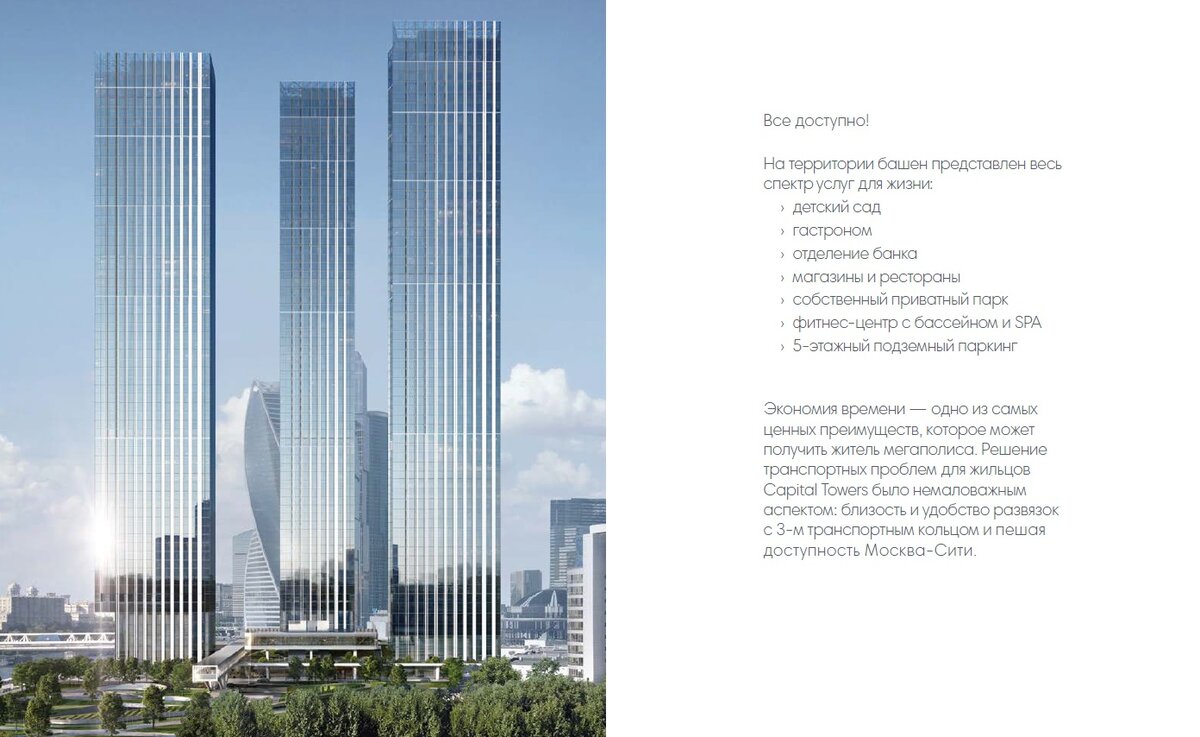 Добрый день, друзья! Сегодня хочу предложить Вам прочесть наш обзор про новый проект на Краснопресненской набережной - первые небоскребы с квартирами. Проект по-настоящему интересный и уникальный в своем роде. Это первые небоскребы с квартирами в районе Москва-Сити. Проект удачно удален от основного Сити, но при этом находится рядом со всей пестрой инфраструктурой этого района. Также имеет свой личный вход в Краснопресненский парк и потрясающие панорамные виды. В общем, есть что обсудить и давайте это сделаем. Итак, Capital Towers состоит из 3 башен по 61 этажу и включает в себя: 2. 787 квартир с отделкой премиум уровня от итальянца Антонио Читерио. Безусловно это плюс. Боюсь представить сколько лет делали бы ремонт в 787 квартирах на 61 этаже. Мне кажется, что это не закончилось бы никогда. В заявленную отделку входит отделка всех жилых зон и санузлов. Никакого шума - вам останется только обставить квартиру и украсить предметами интерьера. Еще один плюс, который стоит отметить -