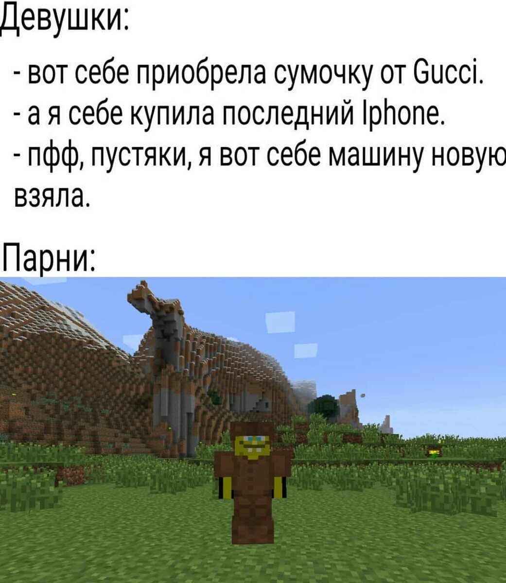 Всем привет. Это 9 выпуск мемов про майнкрафт. Благодарю за хорошую активность под прошлой статьей. И когда на этой наберется.... Стоп, не, я не буду вас заставлять ставить лайки и ждать, когда выйдут новые мемы. Просто, если понравилось, то оцени. Мне будет приятно. [upd] Зацени мою группу ВК. Уверен, это лучшее, что ты видел за последнее время - раздави меня. 1. 2. До сих пор ожоги... 3. 4. 5. 6. Ауф (чтобы это не значило) 7. 8. Жалко друга((( 9. По просьбе одного из подписчиков я открываю рубрику "Мемы от подписчика". Вам нужно придумать смешную фразу к шаблону и написать ее в комментариях. И из самого залайконного коммента сделаю мем. Прошлые мемы: Отборные мемы Minecraft (ч8) Отборные мемы Minecraft (ч7)