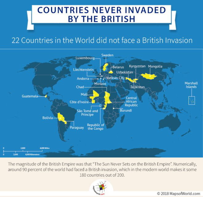 Наконец, многие пишут про Британскую империю. Вот любопытная карта – страны, куда британцы никогда не вторгались (лишь около 10% всех стран мира):