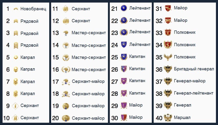 Звания начинаются с самого начинающего — «Новобранец» (выдается при первом запуске игры), до последнего — «Маршал» (последний 40й левел):