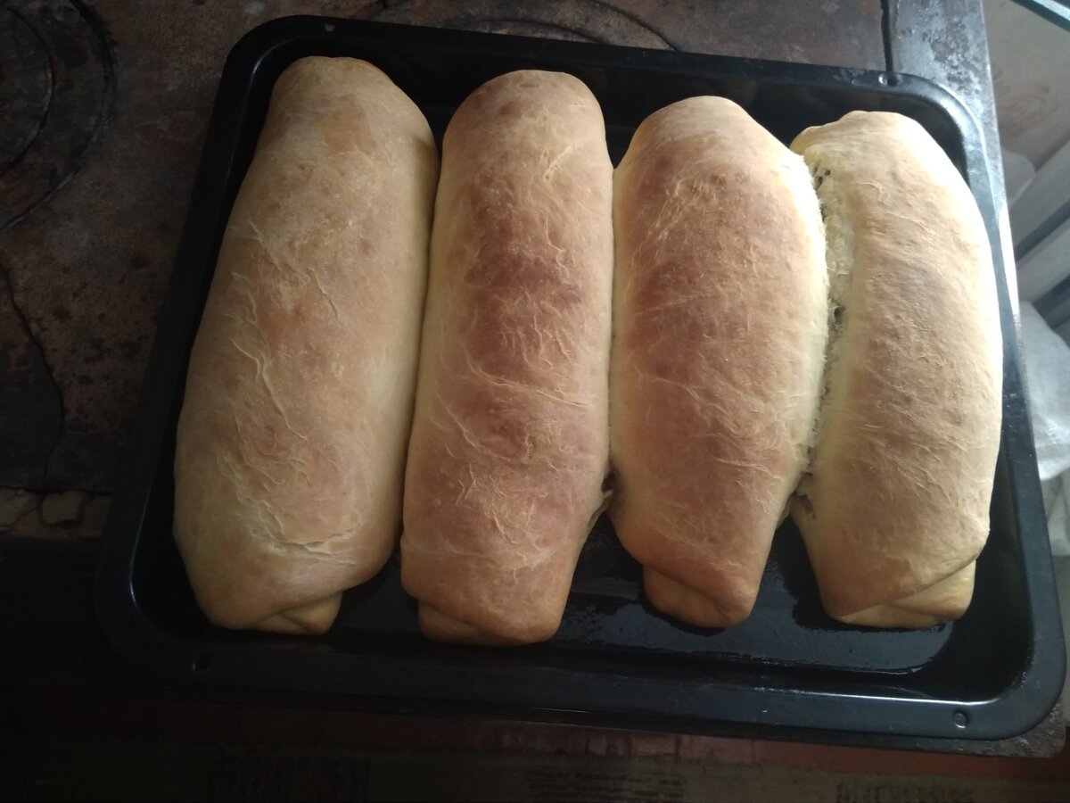 Тесто не должно подходить по этому рецепту, поэтому этот рецепт для меня находка. Трачу на приготовление два часа (вместе с выпеканием). Для рулетов понадобится: 1 литр молока, мука, два яйца, дрожжи, подсолнечное масло, мак, сахар. В банку с молоком (она должна быть немного неполной) добавляю столовую ложку сухих дрожжей и столовую ложку сахара. Молоко должно быть теплым. Ставлю в теплое место на 10-15 минут. Когда дрожжи поднялись замешиваю тесто. Добавляю в тесто яйца. Если тесто липнет к рукам, то смазываю руки подсолнечным маслом. Даю тесту отдохнуть минут пятнадцать. Делю тесто на 4 равных части Раскатываю скалкой часть теста, смазываю подсолнечным маслом и выкладываю начинку. В начинке у меня еще поджаренные орехи и порезанные цукаты. Скручиваю рулеты и выкладываю их на смазанный подсолнечным маслом противень. Сверху рулеты также смазываю подсолнечным маслом. Даю рулетам подойти минут 10 в разогретой до 50 градусов духовке. Пеку рулеты при температуре 170 градусов. Через полчаса