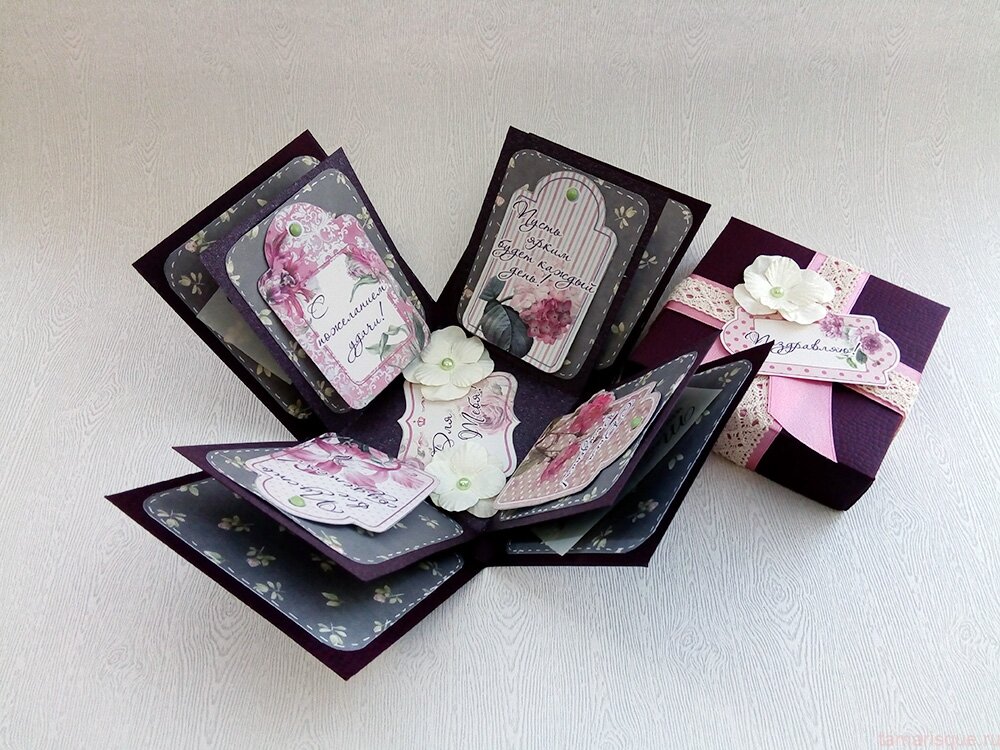 Декор внутренних частей коробочки можно дополнить самостоятельно, наклеив фотографии, дорогие вам и получателю сюрприза, написать своей рукой что-то приятное, прикрепить мелкие предметы, напоминающие о каком-то событии — фантазировать можно бесконечно и такие детали только увеличат ценность вашего подарка!