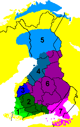 Финский делится на две основные ветви, восточную и западную, и те делятся на основные группы, которые имеют подгруппы. Основными группами восточной части являются савонские (6) диалекты и юго-восточные диалекты (7). Западные диалекты более разнообразны, и их основными группами являются юго-западные диалекты (1), тавастские диалекты (2), юго-западные средние диалекты, юго-остроботнский диалект (3), средний и северо-остроботнийский диалекты (4), а также крайний северный диалект (5). Самая основная особенность, которая разделяет диалекты, заключается в том, что имеет ли диалект звук, соответствующий слабой степени / t / (/ d / в стандартном финском языке) или нет. У восточной части нет никакого звука, у западных диалектов есть (были) различные варианты. Традиционно все подгруппы были разделены на деревенские диалекты, но в настоящее время нереально утверждать, что у каждой деревни есть свой диалект. Вместо этого диалекты несколько сливаются, и южные (тавастийские) черты довольно обширны