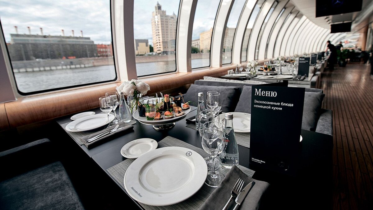 Оба проекта реализованы в партнерстве с отелем Radisson Royal, Moscow. Валерий Меладзе, Алексей и Галина Немовы Эксклюзивная мобильность на воде Новая яхта Mercedes-Benz – самый роскошный способ познакомиться с великолепными панорамами Москвы. СУПЕРЪЯХТА ДЛИНОЙ 60 М И ШИРИНОЙ 12 М полностью обновлена дизайнером Владимиром Родичевым, отделана и переоборудована в соответствии с философией современной роскоши Mercedes-Benz. Здесь могут разместиться 140 человек в общем зале, 28 в первом классе и 52 на открытой террасе. Снаружи и внутри во всем чувствуется дух Mercedes-Benz, даже в мельчайших деталях – в оформлении, на бокалах или на одежде официантов. Чтобы предложить своим гостям настоящую национальную кухню и оригинальные коктейли на борту, шеф-повар прошел стажи-ровку в Германии. Считается, что это лучшая современная немецкая кухня в российской