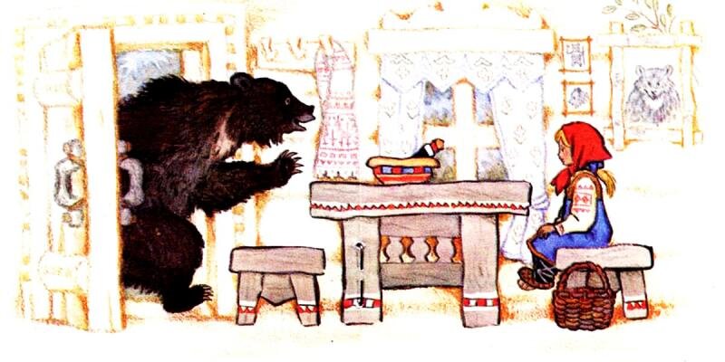 Пришла она в самую глушь, в самую чащу. Видит-стоит избушка. Постучала Машенька в дверь — не отвечают. Толкнула она дверь, дверь и открылась.