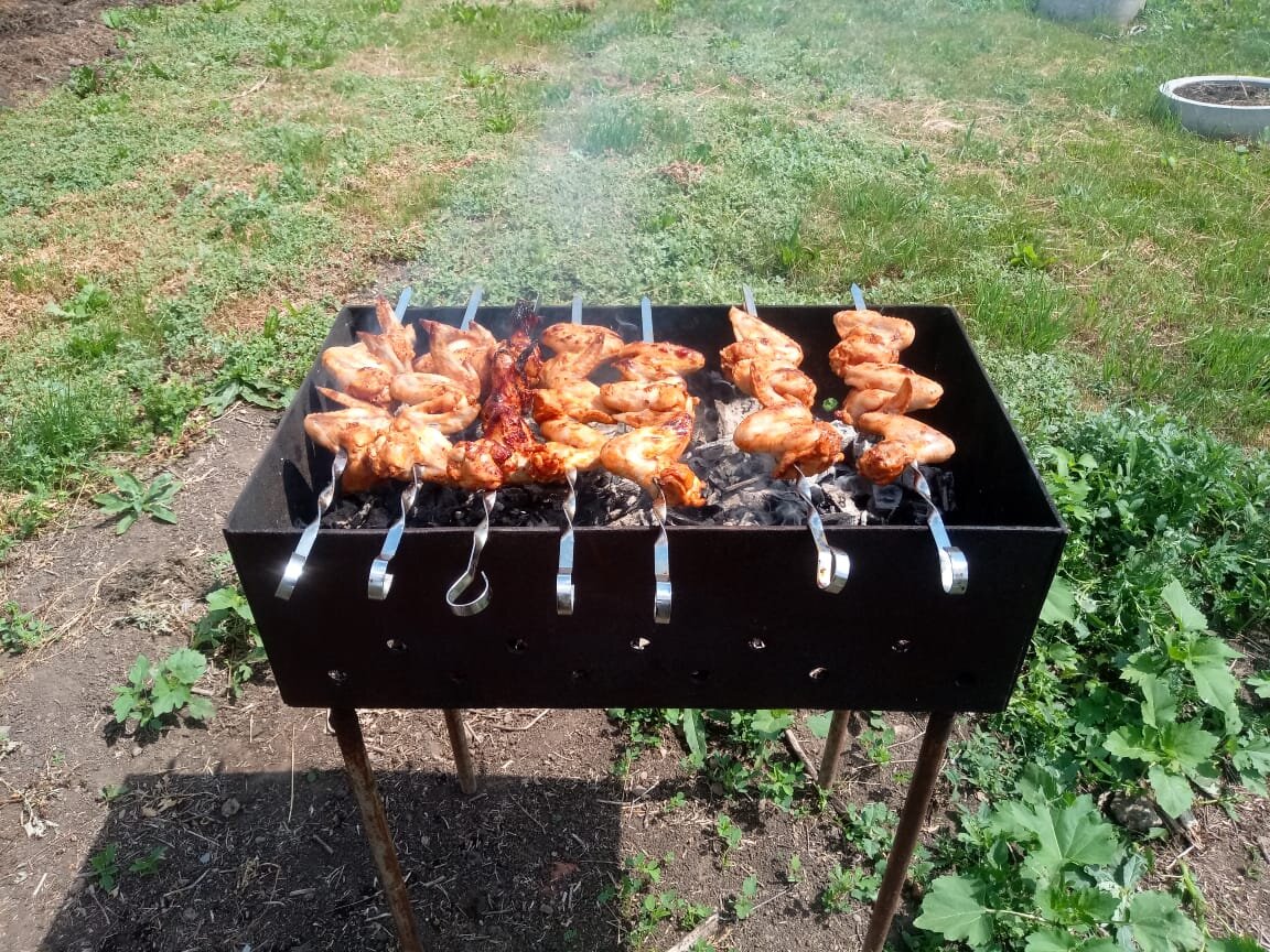 - Время приготовления крылышек на мангале 25-40 минут в зависимости от жара углей. Индикатор готовности — золотистая корочка, и надрезав мясо, из него должен сочиться прозрачный сок.