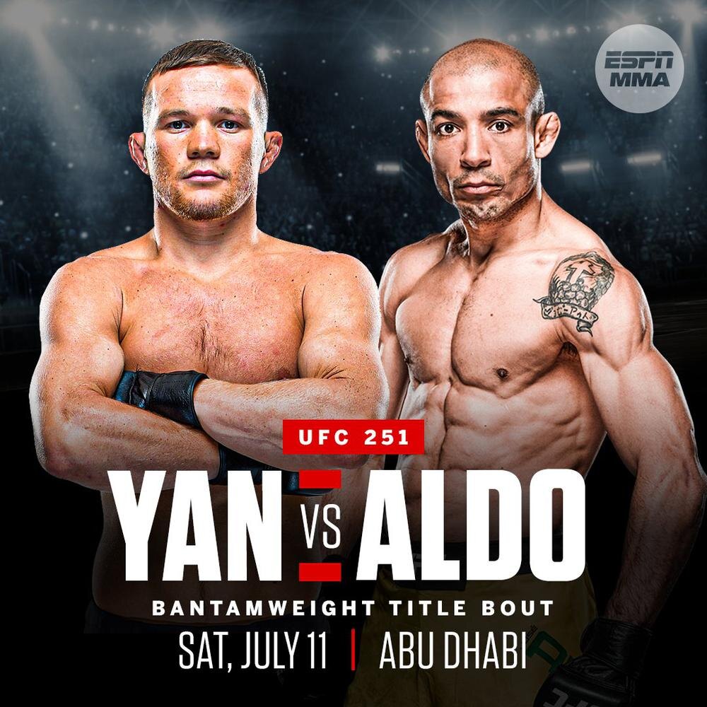 Президент UFC Дана Уайт в разговоре с ESPNанонсировал грандиозный турнир и назвал локацию «Бойцовского острова». 11 июля в Абу-Даби (ОАЭ) на острове Яс пройдёт ивент UFC 251, в рамках которого состоится сразу три титульных поединка. В одном из них россиянин Пётр Ян сразится с экс-чемпионом UFC в полулёгком весе Жозе Альдо за пояс чемпиона в легчайшем дивизионе. Напомним, что этот титул остался вакантным месяц назад после ухода из ММА Генри Сехудо. В ко-мейн ивенте состоится реванш между чемпионом в полулёгком весе Алексом Волкановски с прежним обладателем этого звания Максом Холлоуэем. Напомним, что в декабре 2019 года Волкановски победил Холлоуэя единогласным решением судей. А главным боем турнира станет защита Камару Усманом своего титула в полусреднем весе против Гилберта Бёрнса. Также на турнире пройдут ещё несколько интересных поединков, среди них реванш двух экс-чемпионок UFC в минимальном весе Джессики Андраде и Роуз Намаюнас, бой экс-чемпиона UFC в лёгком весе Фрэнки Эдгара п