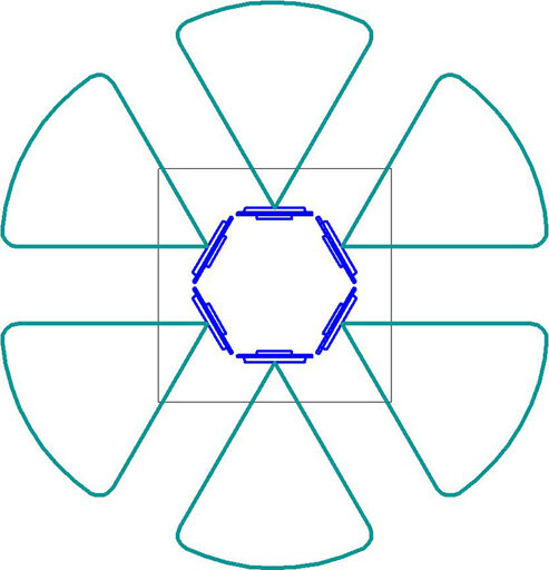 Как следует из их названия, секторные антенны принимают (и передают) сигнал с определённого сектора. Этот сектор обычно составляет в горизонтальной плоскости 60°, 90° или 120° и от 5° до 15° в вертикальной плоскости. Секторные антенны, в основном, ставят на базовых станциях операторы сотовой связи или мобильного интернета, или их используют в составе ретрансляторов. Для того чтобы в любой точке вокруг базовой станции был сигнал, используются такие схемы установки антенн: – 6 антенн с диаграммой направленности (далее ДН) по 60°; – 4 антенны с ДН по 90°; – 3 антенны с ДН по 120°. У секторной антенны во всех рабочих направлениях её диаграммы направленности примерно одинаковое усиление сигнала. В этом состоит первое отличие секторных антенн от обычных направленных, у ДН которых есть ярко выраженный максимум, спадающий к её границам. Узкая ДН в вертикальной плоскости позволяет секторной антенне принимать (и передавать) сигнал только от устройств, находящихся на поверхности земли и немного