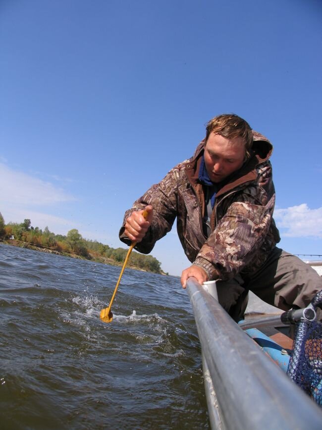 Теперь поговорим о длине отпуска приманки от дна лодки. Я сам до сих пор не определился, каков самый оптимальный спуск, на сколько метров опускать. Геннадий Атанов в свое статье писал – 4 м, я же для себя определил, что 4 м - это лишь минимальное расстояние от лодки. Ближе к лодке сом может и не подойти. Так что держу насадку на четырех - шести метрах. Там, где глубина небольшая, порядка 6 - 8 м – разумеется, отпуск минимальный – 4 м, а если глубина 10 и более метров – спускаю ниже, до шести метров. Ниже не опускаю по личным соображениям. Мне кажется, что если сом всплыл – он просто должен как-то восполнить потерю затраченной энергии, т.е. что-то скушать.
