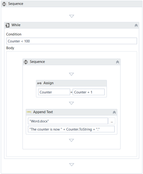 Действие While позволяет повторно выполнять определенный процесс при выполнении определенного условия. Основное различие между этим действием и Do While заключается в том, что в первом случае условие оценивается до выполнения цикла. Этот тип действия может быть полезен для пошагового перебора всех элементов массива или многократного выполнения определенного действия. Пример использования действия While Чтобы продемонстрировать, как использовать действие While, давайте создадим автоматизацию, которая увеличивает численную переменную от 10 до 100 и записывает все числа в документ Microsoft Word. Примечание: Это действие является частью пакета Word activities. Если у вас его нет, используйте функции диспетчера пакетов для его установки. Примечание: Убедитесь, что документ Word не используется при запуске автоматизации, в противном случае отображается сообщение об ошибке и выполнение останавливается.