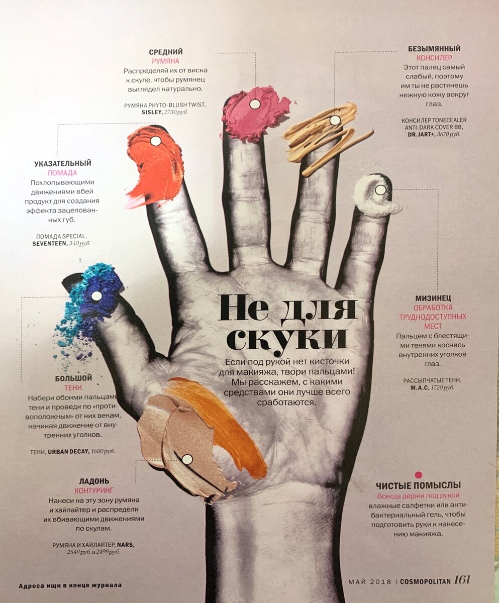 Сразу обозначу. Руки у меня две, и я правша. Надоумила меня на экспериментальный макияж статья в одном глянцевом журнале. Вот идейный скан. Шаг 1. Тщательная обработка пальцев-кистей и обеих рук целиком. Салфеткой, водой или антисептиком.