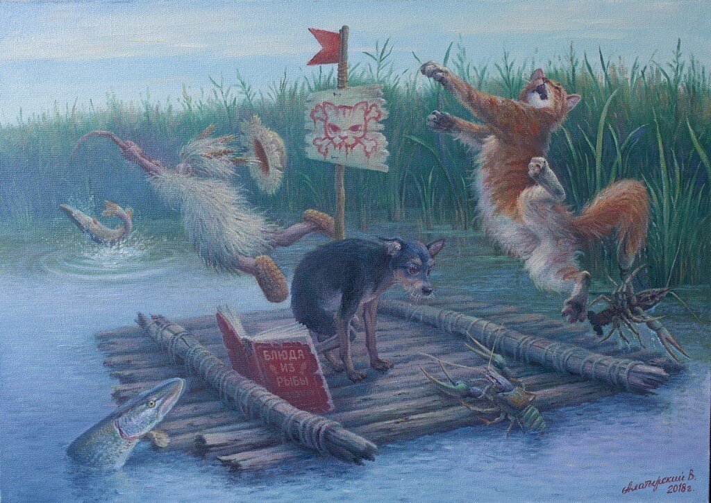 Приплывал Водяной. Кот спросил у него — водится ли здесь рыба… Кто ж знал, что это у него больное место и с ним никто не водится? Добрый Кот решил позаботиться о его здоровье и притащил какую-то жестянку, чтобы тот не сидел на сырой земле.. Кот у меня хоть и добрый, но совсем не следит за новинками фольклора… Сидим, успокаиваем Водяного.